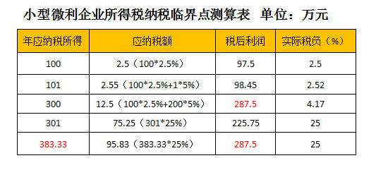 依据现行这3个政策规定,还可以测算出的小型微利企业所得税纳税临界点: