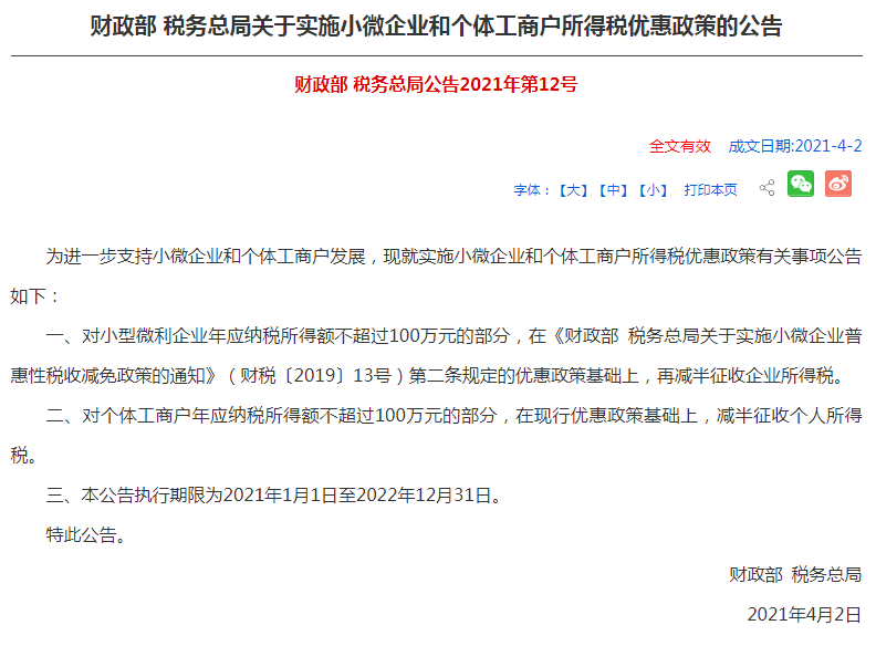 应纳税所得额100万以内的部分从2019年13号公告减按25%征收,到2021年12号公告再减半,最终实现了目前2.5%的税负率。