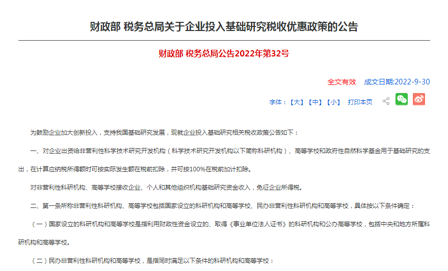 《财政部 税务总局关于企业投入基础研究税收优惠政策的公告》财税2022年32号。